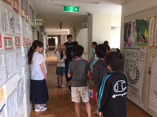 1年生の教室前、廊下の壁には「どうぶつのさんぽ」という図工で取り組んだ作品が展示されています。筆を使い、いろいろな色で画用紙の上に描きました。本当に動物が歩いた跡のように仕上がりました。