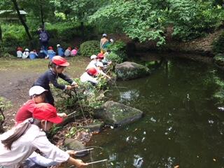 雨上がりで、少々足下が悪い場所もありましたが、「安全に」「仲良く」を心がけて「ざりがに釣り」がスタートしました。さぁ、ざりがには釣れたかな・・・。