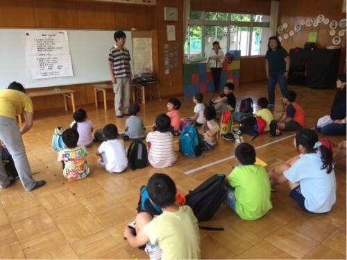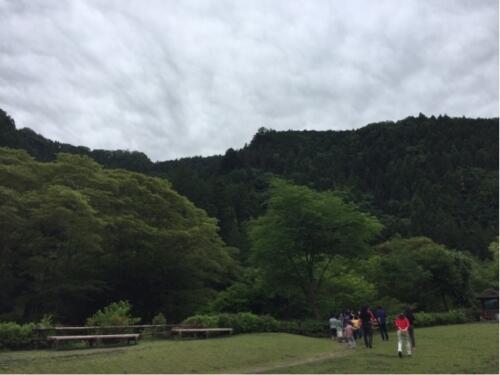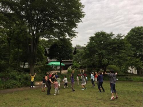 みんな元気に起きてきました。体調も良いようです。朝の集いを、芝生広場で行いました。