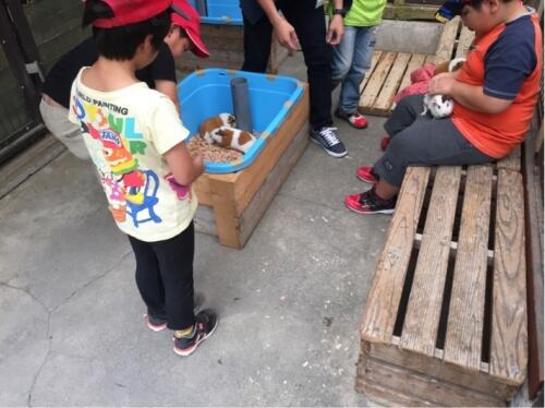 飯ごう炊飯、片付けも終わり、小動物とのふれあい体験をしています。
