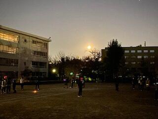 暗くなった校庭に全員集合。みんなで一緒にやりたかった花火です。派手な打ち上げ花火はありませんが、グループで輪になり、手持ち花火を楽しみました。最後に、今練習している表現運動を暗い中で踊りました。手には蛍光色に発光する棒をもっていたので、とってもきれいでした。子供たち自身も暗闇の中での踊り、楽しかったようです。
