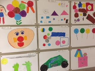1年生の作品です。「かたちをうつして」という学習で取り組み、できあがった作品が並んでいます。丸や三角、四角など、いろいろな形を写し、意識しながら、それぞれの絵に仕上げています。形だけでなく、どんな色に塗るか、何を使って塗るか、どんな構図にするか・・・一人一人のオリジナルができあがっていきます。