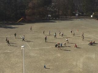 2時間目の校庭。5年生が1組&2組合同で、体育の授業に取り組んでいました。「サッカー型」の運動に取り組んでいましたが、各担任の先生に加え、副校長先生が一緒に授業を進めました。「ゲストコーチ」というところでしょうか。
