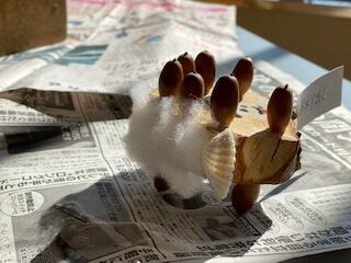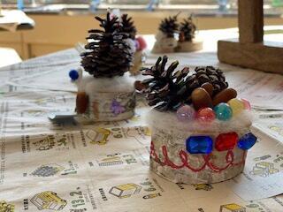 午前中は、先日の林業体験で切り出した白樺の丸片を使って工作を楽しみました。どんぐりやその他の木の実や装飾品を思い思いに持ち寄り、素敵な作品を作り上げていました。
