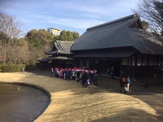 以前連光寺地区にあり、今の場所へ移築されたという「旧富澤家住宅」。3グループに分かれて活動しました。入口の門(「薬医門」というそうです。)をじっくり見たり、この屋敷にしかなかったという式台付玄関から奥の間へ上がったりしました。また、土間やいろりのある部屋を見学しました。ビデオでは、この場所へ移築が完了するま作業の様子などを見て学びました。