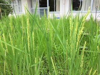 まだ青々としてはいるものの、どんぐりの実がたくさん枝についています。イチョウの木には、銀杏の実が実っています。(この写真ではわかりにくいですね。)5年生が手がけている稲も育ってきました。