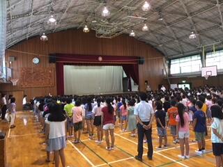 1学期の終業式は放送で行いましたが、今日はやっぱり一堂に会して、みんなで顔を合わせたいと考え、体育館で行いました。早い時間から空気を入れ換え、大型の扇風機を回し、環境を整えました。