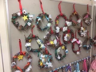 1年生教室前の廊下の壁に、素敵なリースが並びました。1年生たちが頑張って作った手作りのリースです。土台になっているのは・・・そうです。芋掘りをしたときに穫り、乾燥させておいた、さつまいもの「つる」です。その土台に、思い思いの飾り付けをし、一人一人オリジナルの素敵なリースができあがりました。