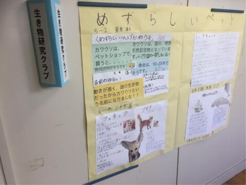 2階のランチルームとミーティングルームの間の壁に、生き物研究クラブの人たちが取り組んだ成果が作品として展示されています。「めずらしいペット」をそれぞれ取り上げ、調べた内容をまとめてあります。