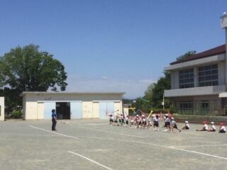 校庭での様子です。体育に取り組む1年生たち。そして、奥にはこぐま保育園の園児たち。