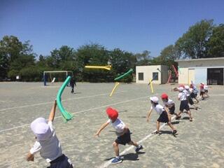 写真は、1年生の体育の活動です。校庭で「投げる」という運動・動作をポイントにした学習に取り組みました。ボールを使ったり、ロケット状の器具を使ったりしながら、「投げる」という動きを繰り返し行いました。