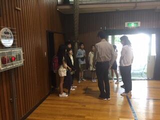 雨が上がったおかげで、3時間目の避難訓練を予定通り実施することができました。今日は、主事室から火災が起こったという想定で、使用できない階段を確認しながら、安全・確実・迅速に校庭へ避難するという訓練です。1年生もしっかりと参加し、避難の仕方を学びました。