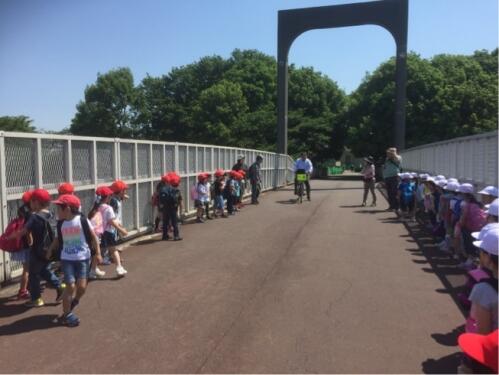 途中、線路が見下ろせる橋で、しばし行き来する電車を見て、楽しみました。偶然ですが、昨年度まで永山小にいた副校長先生にお会いできました。
