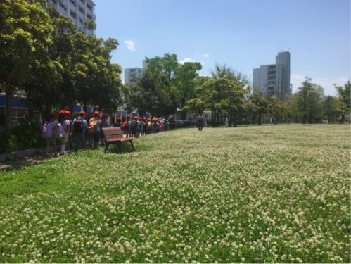 永山南公園にやってきました。シロツメクサが広場一面に咲いています。