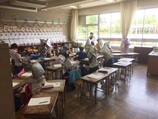 雨が上がったおかげで、3時間目の避難訓練を予定通り実施することができました。今日は、主事室から火災が起こったという想定で、使用できない階段を確認しながら、安全・確実・迅速に校庭へ避難するという訓練です。1年生もしっかりと参加し、避難の仕方を学びました。