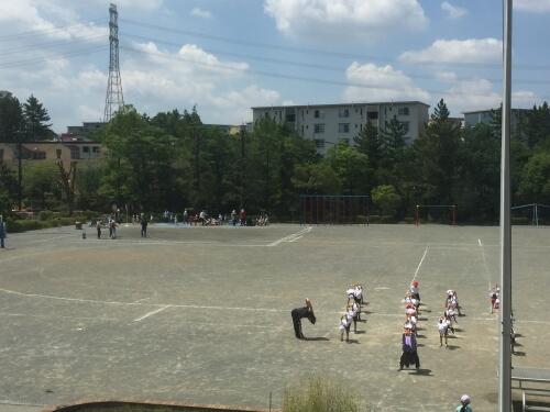 校庭での様子です。体育に取り組む1年生たち。そして、奥にはこぐま保育園の園児たち。
