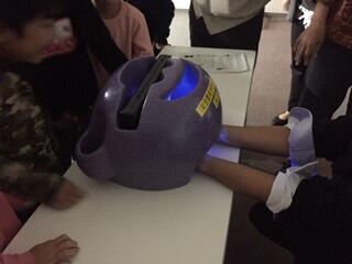 保健所の方から、資料を基に保健所の概要や、いくつかの具体的な活動について丁寧に説明をしていただきました。花粉症に関わる花粉の飛散を調査する取り組みでは、実際に調査器具を設置しているところを見せていただきました。衛星に関しては、手洗いの仕方について、実際に手洗いの前と後を見比べる機会を作ってくださいました。具体的な活動を通して、保健所の役割がイメージできたかと思います。