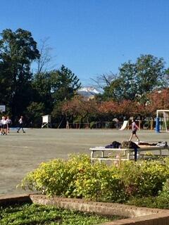 校庭のちょっとしたポイントから見ると、花壇の花、校庭の紅葉、富士山の白い雪、そして青空と、上から青、白、赤、黄の色の競演がとてもきれいです。うーん、写真だとうまく伝わらないかもしれないです・・・。