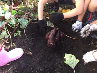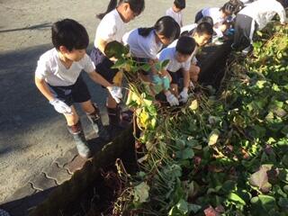 今日は、1年生が芋ほりをしました。学年の畑で育ったさつまいもを、1時間目と5時間目に分かれてクラスごとに掘りました。ツルを引っ張り、土を手で堀り、目指すは大きなさつまいも!幸い、大きく育ったさつまいもがたくさん掘れて、子供たちも喜んでいました。まるでかぼちゃのような形をしたものもあり、掘り出した子は、びっくりしていました。