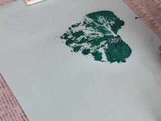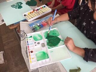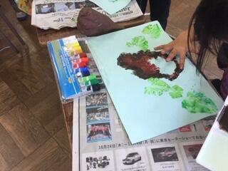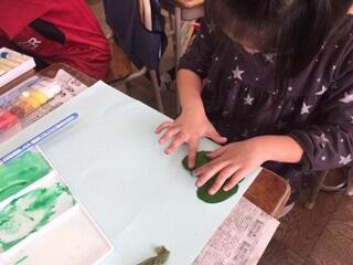 芋ほりで頑張った1年生。午後にはさっそく、さつまいもの葉っぱを使って「さつまいもの絵」作りに取り組みました。葉っぱに絵の具で彩色し、画用紙にスタンプの要領で押し付けていきます。葉っぱの形や葉脈が見えて、本物の葉っぱのようです。画用紙の真ん中あたりには後でおいもを描くスペースを残しておきました。