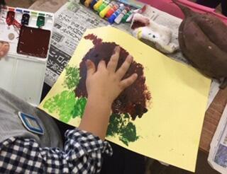 昨日、芋ほりをした1年生。今日は、サツマイモの絵を仕上げていきました。昨日葉っぱのスタンプを押した画用紙に、今日はお芋本体を描きました。筆は使わず、指で絵の具を画用紙に付けていきました。お芋の実物を目の前に置き、形や色を意識しながら進めていきました。