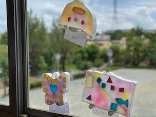 3年生の図工の作品です。色とりどりの素材で作った模様を、薄い紙でおおい、ステンドグラスのように仕上げた作品です。形、色合いもそれぞれ素敵です。色の重なり合いもいい味を出していますね。なんだか、欲しくなってしまうくらいです。