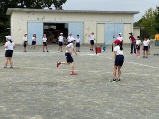 4年生の体育。今日は「ティーボール」に取り組んでいました。3チームに分かれ、試合をしないチームは審判を務めました。