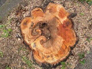 今日は、9月17日(木)です。今、永山小学校の脇を駅に向かった下っていく道路では、だいぶ古くなり、老朽化してきた木々を伐採する作業が行われており、通ってみるとなんだか景色が変わっています。そばへ行ってみると、太い木を切った後の断面がきれいに残っていました。気の種類によっても違うのでしょうが、今日見つけた木の断面は、不思議な模様のように見えました。