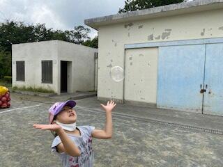砂を使った遊び、手のひらを使ってのシャボン玉作り、水やり用のペットボトルを使って校庭に水で絵を活動をしました。