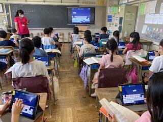 3年生の学習です。ローマ字の学習に取り組んでいました。一人一台タブレットを使い、担任の先生の指示や電子黒板に映し出される情報を活用しながら取り組んでいました。ICT支援員の方も、一緒に支援をしてくださいました。