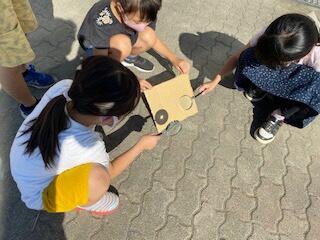 この実験には絶好の天気だったのではないでしょうか。3年生が理科の学習に取り組んでいました。「校長先生もよかったらやりませんか。」とお誘いをいただいたので、子どもに戻ったつもりで一緒にやらせてもらいました。光の集まり方、集まった光の大きさと光の強さ、熱さ(煙が出るのか・・・)などを観察しあいながら進めました。