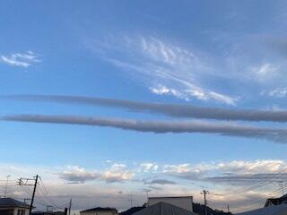 朝、北東の空を見上げてみました。「あっ、くじら雲みたい!」と思うような雲が空に横たわっていました。飛行機雲とは違い、幅のある帯状の雲でした。なんていう雲なのでしょうか・・・。(「帯状のレンズ雲」?・・・違うかー)