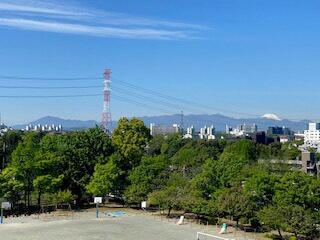 今日は、4月22日(木)です。校舎4階の「スペース4」から見る、いつもの見慣れた風景です。この新年度が始まるころからは、空気中の水分が多くなるからでしょうか、遠くの山々が、あまりくっきりと見えることがなくなってきます。でも、今日は久しぶりに空気が澄んでいて、丹沢、道志の山々、奥多摩から奥秩父、そして残雪の富士山がきれいに、くっきりと見えていました。それだけで何だかうれしくなってしまいました。