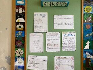 「1年生へのインタビュー」「新しく来た先生への質問」「コロナがおさまったら、どこへ行きたい?アンケート」「母の日について」など、楽しい内容が紹介されていました。また、委員会の一員としての目標を揚げているポスターもありました。とっても頼もしく、とっても楽しみです!