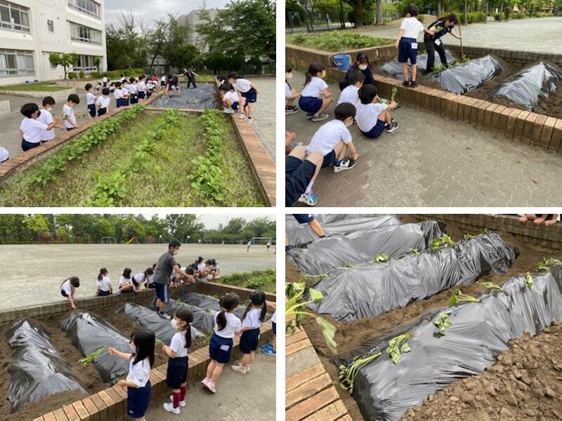1年生の生活科の授業の様子です。今日は、畑にさつまいもの苗を植えました。秋にはきっと、大きなさつまいもが実ることでしょう!一人一本ずつ苗をもらい、順番に畑の畝に苗を植えていきました。楽しみだなー。