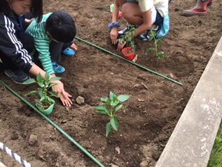トマト・ピーマン・なす・枝豆を役割分担しながら植えていきました。手で土を掘る。どのくらいの穴を掘ればいいか見当をつける。手指を使って、苗をていねいに扱う。