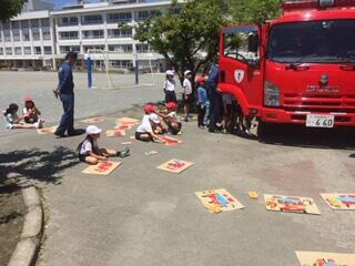 消防車の特徴を、細かなところまで見て、絵に描きこんでいました。消防士の方が、実際に消火する時の装備をつけてくださり、子供たちはうれしそうに描いていました。