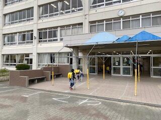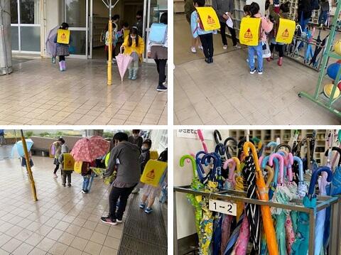 朝、登校してきた1年生たちは、差してきた傘の後始末を頑張りました。昇降口に入る前に傘を閉じ、水を落とし、テープで傘を巻き閉じます。手も濡れており、なかなかうまくできない人もいましたが、頼りになる6年生が見守ったり、手を貸してあげたりしていました。
