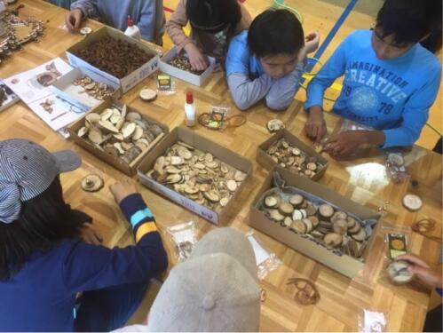 体育館で、「木バッヂ」作りです。はんだごてで焼き目をつけて模様にしたり、木片や枝、木の実などを糊付けしたりしながら想い想いのバッヂに仕上げます。