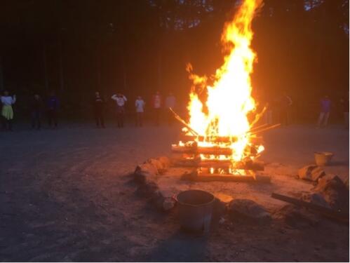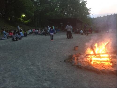 今夜は天気が良さそうです。さぁ、キャンプファイヤーの始まりです。係の人たちは、早い時間から集まり、準備と練習にがんばりました!聞いた話ですが、火の神が、校長にそっくりだったそうです!