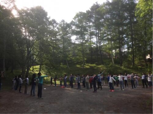 自由広場で朝の会です。ラジオ体操。身体をしっかりほぐしましょう。