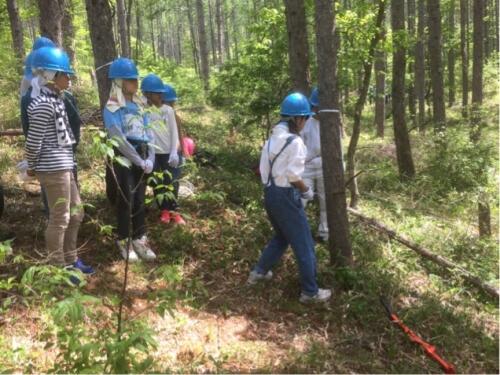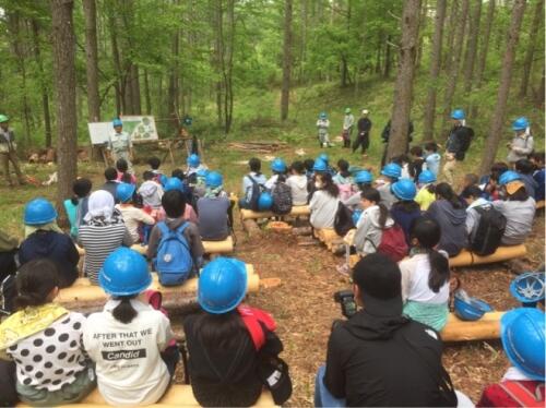 林業体験の始まりです。宿舎から20分ほど歩いたところにある、国有林で行います。まず、森林についての学習です。