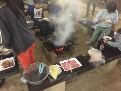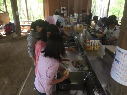 避難訓練や係の打ち合わせを終え、野外炊事場でバーベキューです。下ごしらえが始まりました。