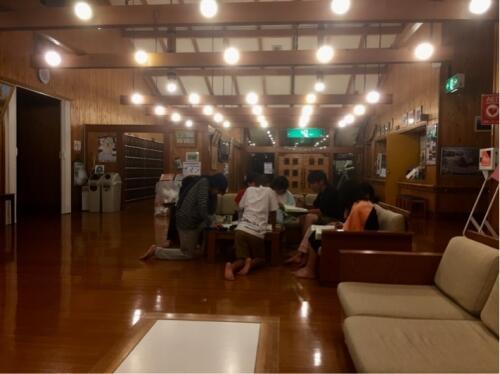 ナイトハイクの準備をして、ホールに集まったのですが・・・。雨が降ってきてしまいました。しばらく様子見て待っていたのですが、残念ながら中止としました。今日は、ずっとノンストップで頑張ってきたので、しっかり時間をとって入浴や部屋での活動を進めていきます。