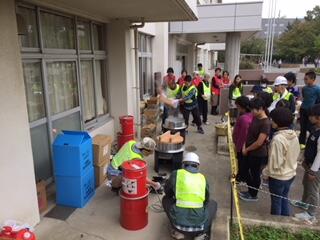 次に、AED訓練、炊き出し訓練、車椅子での移動体験です。炊き出しは実際にやるのではなく、大きな釜でお湯を沸かすための手順を見せていただきました。