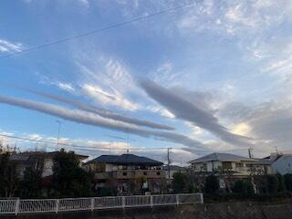 朝、北東の空を見上げてみました。「あっ、くじら雲みたい!」と思うような雲が空に横たわっていました。飛行機雲とは違い、幅のある帯状の雲でした。なんていう雲なのでしょうか・・・。(「帯状のレンズ雲」?・・・違うかー)