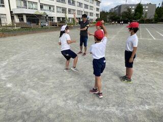 最初に100走に取り組みました。「今日測った記録を基にして、10月31日には、その記録を更新できるように頑張ろう。」と、この取り組みの目標、意味づけを学びました。スターター役をやらせてもらったのですが、スタートを待つ時の表情や緊張感のある動きが、とても印象的でした。真剣な取り組み姿勢の表れなのだと感じました。