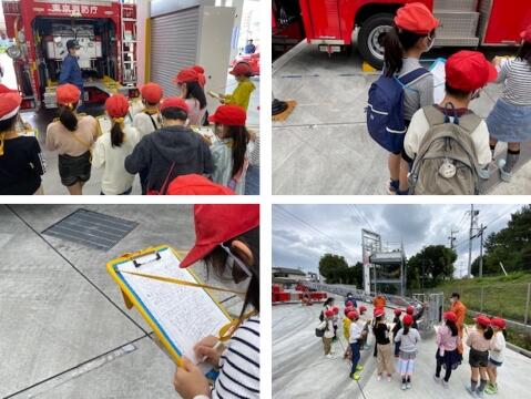 前半は1組、後半は2組とクラスごとに時差をつけて見学をさせていただきました。まず、ポンプ車について見学をしたり、説明を伺ったりしました。いろいろなところを開けて、中に入っている道具やその役割等について教えてくださいました。ポンプ車にはホースがたくさん積まれていること、街中にある「消火栓」から水を吸い上げること、ポンプ車の後ろの扉を開けると、小さな車が入っていて、狭い所でも進んでいけることなど知ることができました。はしご車の見学では、ちょうどタイミングよく、点検で梯子が伸ばされた状態で横たわっていました。「バスケット」と呼ばれる、人が乗るところも間近で見ることができました。はしごは、30m伸び、10階だてのビルくらいまで届くそうです。