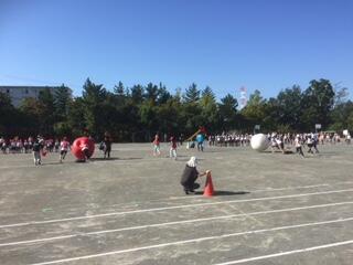 土曜日にできなかった全校競技の「大玉送り」。今日、全校朝会の後、「大玉送り集会」として行いました。運動会の勝敗はもう確定しているので、あくまでも「大玉送りの勝負」として進めました。