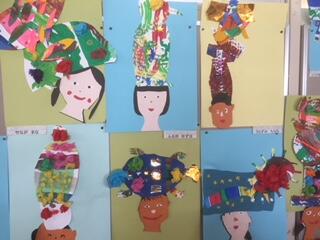 2年生の図工の作品です。教室前の壁に飾られています。自分の顔を作り、頭の上に思い思いの帽子を作ってかぶせました。色鮮やかな帽子、ダイナミックなデザインの帽子など、オリジナリティー溢れる帽子が並びました。とっても素敵です。